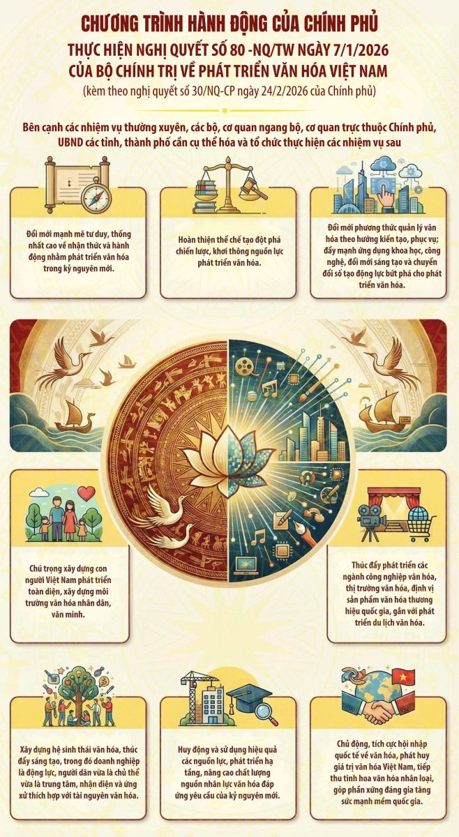 Infographic dưới đây khái quát Chương trình hành động của Chính phủ nhằm hiện thực hóa Nghị quyết số 80-NQ/TW của Bộ Chính trị về phát triển văn hóa Việt Nam, ban hành kèm theo Nghị quyết số 30/NQ-CP. Chương trình xác định 8 nhóm nhiệm vụ trọng tâm, tập trung đổi mới tư duy, hoàn thiện thể chế, thúc đẩy sáng tạo, ứng dụng khoa học – công nghệ và hội nhập quốc tế, qua đó tạo những “đột phá” chiến lược, phát huy sức mạnh văn hóa Việt Nam trong kỷ nguyên mới.