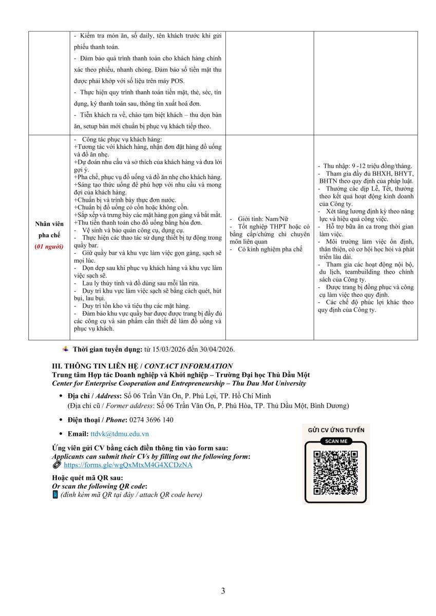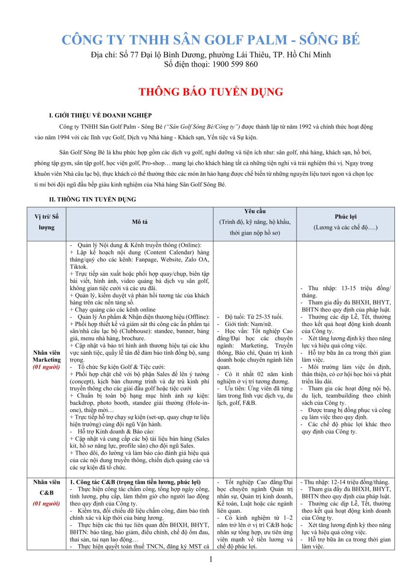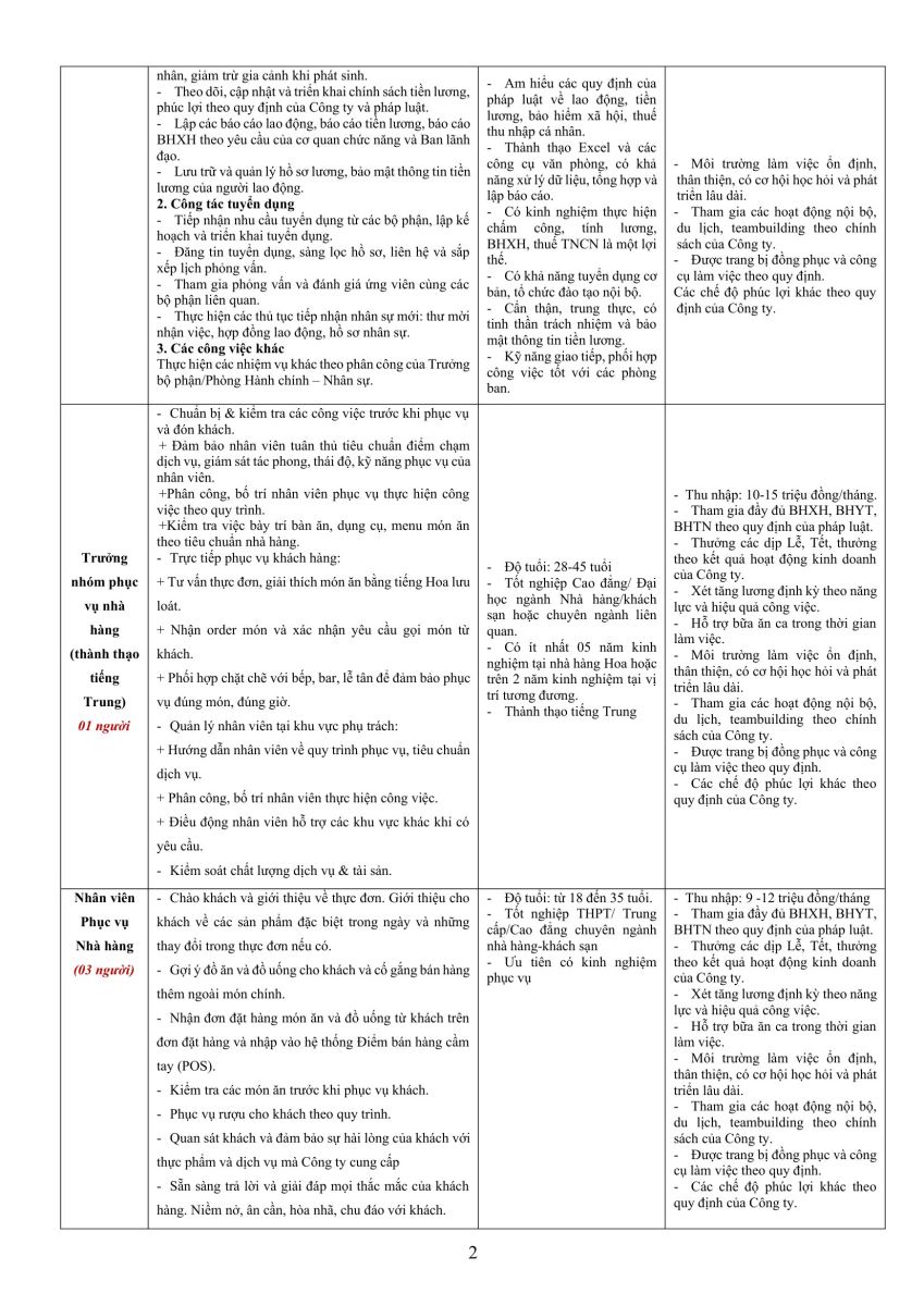 Nhân viên C&B / Nhân viên Marketing / Nhân viên phụ vụ nhà hàng / Phụ bếp / Trưởng nhóm phục vụ nhà hàng (thành thạo tiếng Trung) / Nhân viên pha chế