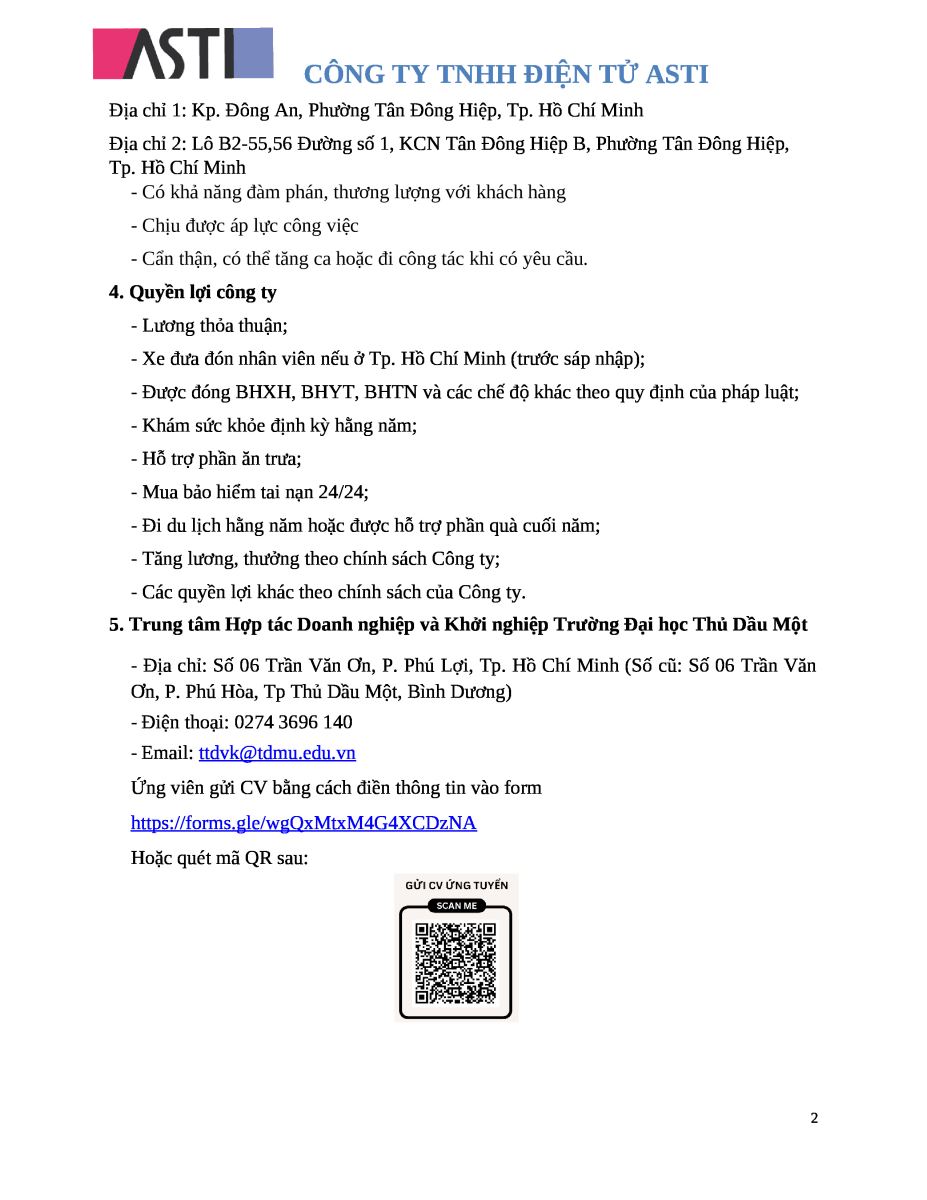 Địa chỉ 1: Kp. Đông An, Phường Tân Đông Hiệp, Tp. Hồ Chí Minh Địa chỉ 2: Lô B2-55,56 Đường số 1, KCN Tân Đông Hiệp B, Phường Tân Đông Hiệp, Tp. Hồ Chí Minh THÔNG BÁO TUYỂN DỤNG Công ty TNHH Điện Tử Asti cần tuyển nhân sự làm việc với các thông tin cụ thể như sau: 1. Vị trí tuyển dụng, số lượng tuyển dụng - Nhân viên kinh doanh: 01 người (Nam/Nữ) 2. Mô tả công việc - Liên hệ và làm việc trực tiếp với khách hàng (trong và ngoài nước): + Nhận đơn hàng và theo dõi tình hình sản xuất và lập kế hoạch xuất hàng đúng hạn cho khách hàng. + Làm việc với hãng tàu, bên vận chuyển, chuẩn bị chứng từ xuất hàng. - Liên lạc với khách hàng để nắm bắt thông tin & giải quyết thỏa đáng các yêu cầu & khiếu nại của khách hàng. - Lập báo cáo doanh thu và chi phí của hàng tháng. Thực hiện các chứng từ giao hàng, hóa đơn VAT. - Làm dự báo đơn hàng để Phòng vật tư đặt hàng. - Tìm kiếm khách hàng mới, tham gia các hoạt động marketing, triển lãm, hội thảo để quảng bá sản phẩm công ty. - Phát triển khách hàng mới và hiện tại: Tiếp nhận dữ liệu Khách hàng và làm giá sản phẩm (bao gồm hiện tại và báo giá mới), giải quyết các vấn đề liên quan đến giá. - Đàm phán giải quyết các vấn đề phát sinh với Khách hàng - Đọc, phân tích Bản vẽ từ Khách hàng. - Thực hiện các công việc khác khi cấp trên giao. 3. Yêu cầu công việc - Trình độ tốt nghiệp cao đẳng trở lên chuyên ngành kinh tế, ngoại thương, kỹ thuật, xuất nhập khẩu, logistic…ưu tiên có kinh nghiệm hoặc am hiểu về kỹ thuật, biết Incoterms, marketing, xuất nhập khẩu… - Ngoại hình ưa nhìn - Biết sử dụng vi tính văn phòng - Giao tiếp tiếng Anh căn bản, biết giao tiếp tiếng Nhật là lợi thế - Có khả năng làm việc độc lập, làm việc nhóm, năng động