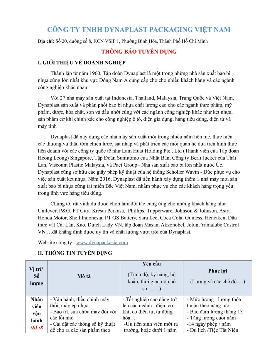 CÔNG TY TNHH DYNAPLAST PACKAGING VIỆT NAM |