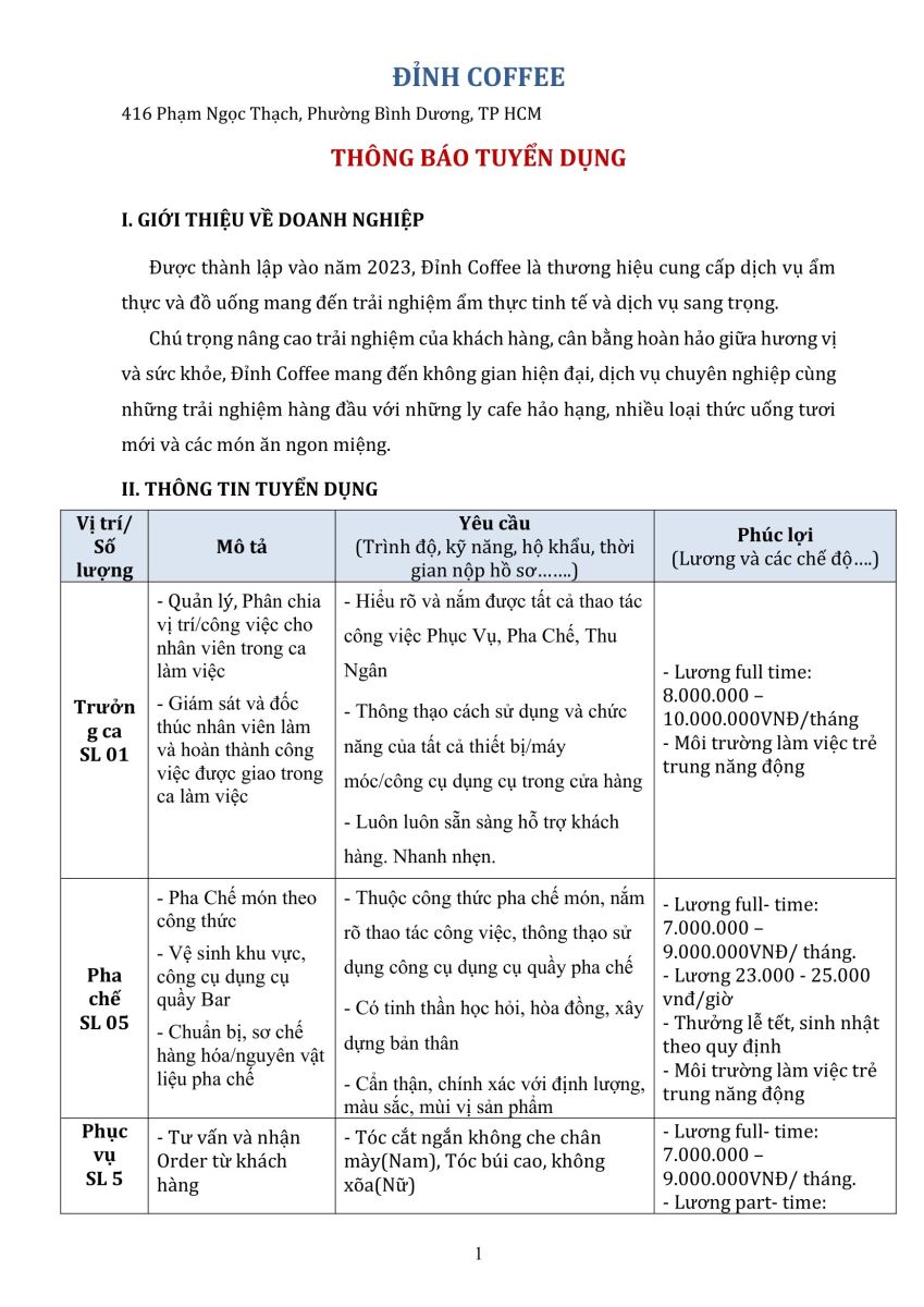 Trưởng ca / Pha chế / Phục vụ